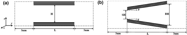 狹縫孔由半有限狹縫孔由兩個(gè)平行的石墨壁組成。每個(gè)壁包含三個(gè)石墨烯層,如圖1(a)所示。框的虛線表示模擬框在y和z方向上的邊界。周期性邊界條件僅適用于x方向。兩個(gè)開(kāi)口端與大塊氣藏相連,每個(gè)氣藏沿y軸的長(zhǎng)度為3nm,孔隙寬度決定了z方向的尺寸。因此,通過(guò)孔內(nèi)分子與體相的相互作用,可以在孔和周圍環(huán)境之間保持機(jī)械平衡?讖紿是指通過(guò)一個(gè)壁最內(nèi)層中碳原子中心的平面與相對(duì)壁的相應(yīng)平面之間的距離。楔形孔在圖1(b)描繪了一個(gè)開(kāi)放的楔形孔及其結(jié)構(gòu)參數(shù):小端(SH)和大端(BH)的孔徑,軸向孔長(zhǎng)(L)和半角(α)?虻奶摼表示模擬框在y和z方向上的邊界。與狹縫孔一樣,開(kāi)口端周圍的氣體沿y軸的長(zhǎng)度為3nm,大端的寬度決定了z方向的尺寸。沿軸向(即,y方向)的孔長(zhǎng)度是有限的L,而在x方向上的尺寸在應(yīng)用周期性邊界條件的情況下假定為無(wú)限。