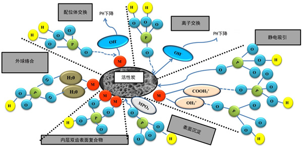 通常,磷的吸附過程是活性炭中的吸熱反應。等溫線包括Freundlich,Langmuir和Langmuir-Freundlich能夠預測廢水中活性炭對磷的吸附。在這些條件下,Langmuir通常更適合實驗數(shù)據(jù)。圖2總結(jié)了磷在活性炭表面上吸附的各種機理。一些機制以高親和力和強度(例如,配體交換和內(nèi)球雙齒)將磷固定在其表面上,而另一些機制以較低的強度(例如,外球絡合和靜電吸引)固定在磷表面,從而降低了除磷效率。