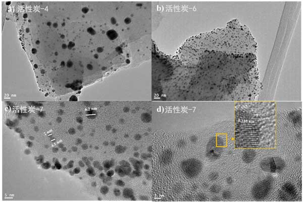 為了進一步研究金顆粒在活性炭表面的分布和結晶度,我們拍攝了鍍金活性炭樣品的透射電子顯微鏡圖像。圖7顯示了各種活性炭樣品在不同放大倍數(shù)下的TEM圖像。圖2a、b顯示了金納米粒子在活性炭表面上的分布。很明顯,兩個樣本的分布是均勻的;钚蕴-4和活性炭-6似乎都以類似的方式相互作用和承載金納米粒子;钚蕴-7樣品的高分辨率TEM圖像如圖2c、d所示。圖2c顯示大多數(shù)金納米顆粒很小,直徑為3-5nm,并且只能看到少數(shù)團聚顆粒。圖2d顯示了金的晶格條紋間距。發(fā)現(xiàn)晶格條紋間距為0.217nm,對應于金晶面的面。此外,我們試圖通過TEM圖像估計顆粒尺寸的分布,我們發(fā)現(xiàn)所有樣品中超過80%的金顆粒的尺寸小于5nm。