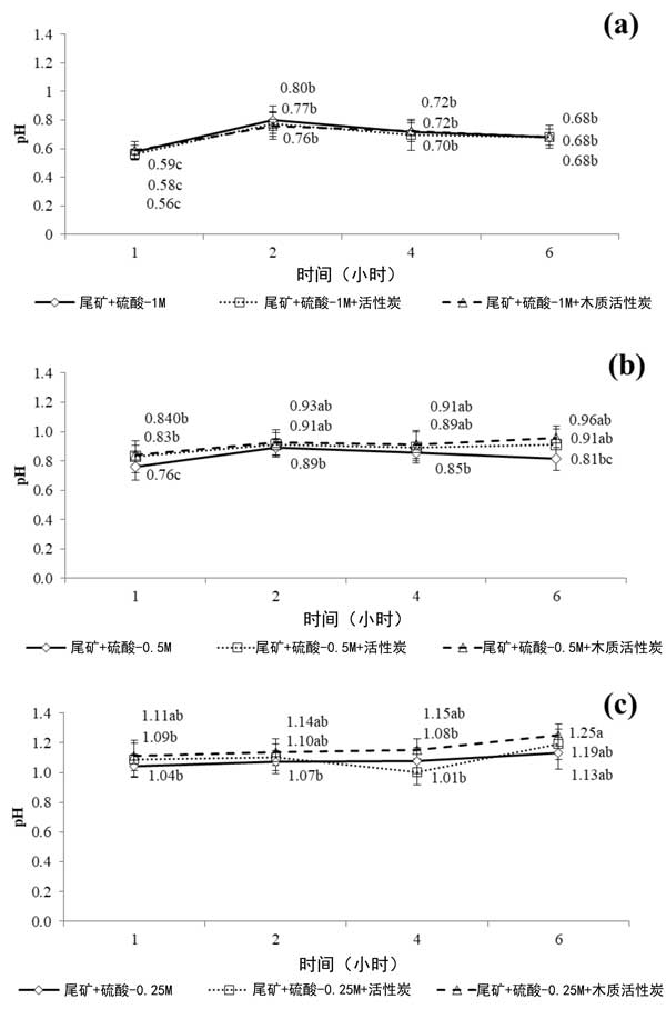在H2SO4-1M中用活性炭和木質(zhì)活性炭處理的對(duì)照尾礦在圖2提供,(3a)中的pH變化,H2SO4-0.5M(3b)和H2SO4-0.25M(3c)浸出溶液。關(guān)于浸出實(shí)驗(yàn)期間的pH演變,盡管活性炭顯示堿性pH,但在不存在或存在活性炭的情況下觀察到小的差異。選擇硫酸作為浸出液是因?yàn)樗梢杂行У剡x擇性溶解Zn化合物而不是Pb和Ca。相反,樣品中的氧化鉛和碳酸鹽會(huì)溶解在硫酸溶液中,然后以硫酸鉛的形式沉淀。然而,當(dāng)在浸出液中加入活性炭時(shí),氧化還原電位的下降幅度高于加入木質(zhì)活性炭后。這一事實(shí)可能與碳基材料與系統(tǒng)中存在的氧化劑種類(lèi)和礦物質(zhì)之間的不同相互作用有關(guān)。事實(shí)上,觀察到在木質(zhì)活性炭催化的黃銅礦浸出過(guò)程中氧化還原電位降低,并將這種影響歸因于礦物和木質(zhì)活性炭在酸性介質(zhì)中的電偶相互作用。