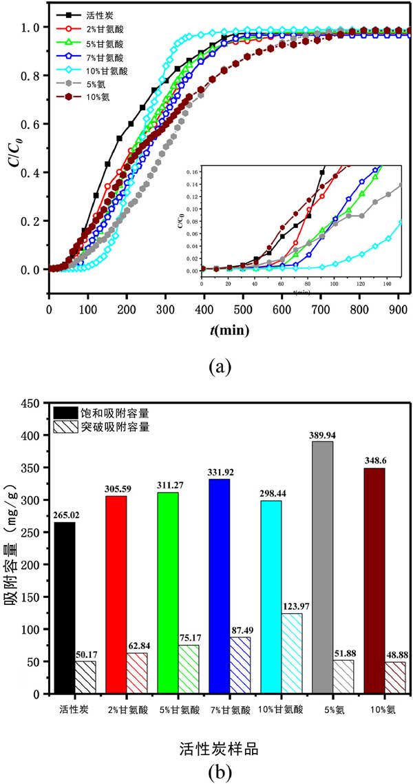 測試了選定的甲苯VOC對活性炭的吸附性能。在每個實(shí)驗(yàn)運(yùn)行中,甲苯通過裝有活性炭的吸附管直到達(dá)到平衡,即活性炭吸附劑被甲苯飽和。圖2(a)所示的穿透曲線呈現(xiàn)為甲苯吸附量吸附(ç/ç0)與接觸時間(噸,分鐘)六種的活性炭正在進(jìn)行中,它們的飽和和突破吸附容量如圖2所示(b)。從吸附曲線可以看出,甘氨酸修飾的活性炭的穿透時間明顯延長,而飽和氨改性活性炭的時間延長;钚蕴可霞妆酱┩肝侥芰Φ捻樞?yàn)?0%甘氨酸改性活性炭>7%>5%>2%>5%氨改性活性炭>未改性活性炭>10%氨改性活性炭,而活性炭對甲苯飽和吸附容量的順序如下:5%氨改性>10%>7%甘氨酸改性>5%>2%>10%>未改性活性炭?梢姼拾彼嵝揎棇妆轿接酗@著的正向影響。與原來的AC相比,甘氨酸改性的活性炭對甲苯的突破吸附能力分別提高了25%、50%、74%和147%,隨著甘氨酸濃度的增加呈上升趨勢。同時,甘氨酸改性的活性炭對甲苯的飽和吸附容量分別增加了15%、17%、25%和13%,且隨著甘氨酸濃度的增加先增加后減少。5%和10%的氨改性也提高了甲苯的吸附性能,但其優(yōu)勢主要體現(xiàn)在飽和吸附容量上,與原來的活性炭相比,分別提高了47%和32%。