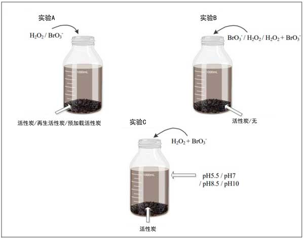 在對50家飲用水公用設(shè)施進(jìn)行的調(diào)查中,獲得過氧化氫和溴化物的平均值來當(dāng)做測試用水。在所有實(shí)驗(yàn)中,批量反應(yīng)器都用薄箔包裹。制備0.052µmol/L溴酸鈉溶液并加入間歇反應(yīng)器中以獲得0.5µmol/L溴酸鹽的濃度。高級氧化工藝中的出水殘留過氧化氫濃度不會(huì)超過180µmol/L。因此,在本研究中,將150µmol/過氧化氫加入到間歇式反應(yīng)器中。如圖1所示,在23–27℃的環(huán)境溫度下,使用36個(gè)批次玻璃瓶進(jìn)行了一系列實(shí)驗(yàn);钚蕴坑昧渴冀K為5g/L,過氧化氫和溴酸鹽濃度始終分別為150µmol/L和0.5µmol/L。所有裝有過氧化氫的間歇式反應(yīng)器都用鋁箔覆蓋,以防止過氧化氫被光潛在降解。在如圖1所示的實(shí)驗(yàn)中,使用16個(gè)間歇式反應(yīng)器和三種不同的活性炭(活性炭、再生活性炭和預(yù)加載活性炭)來研究不同運(yùn)行時(shí)間的活性炭對溴酸鹽和過氧化氫的去除,該實(shí)驗(yàn)涉及八個(gè)處理組。