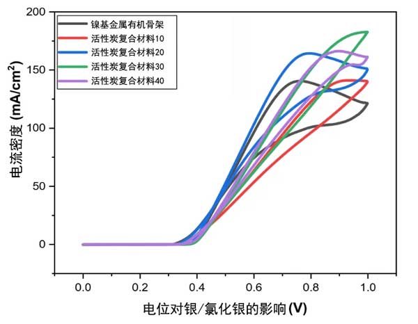 通過在KOH和CH3OH中氧化甲醇,使用循環(huán)伏安法測試活性炭復(fù)合材料的電化學(xué)性能。具有活性炭復(fù)合材料的鎳金屬對甲醇氧化反應(yīng)表現(xiàn)出更高的催化活性(見圖2)。在鎳金屬改性玻璃碳電極的情況下,峰值電流密度沒有添加活性炭的高。具有更高濃度活性炭(40mg)的樣品顯示出高峰值電流密度。隨著活性炭量(60mg)的進(jìn)一步增加,峰值電流密度降會稍微降低。綜上所述,建議將活性炭的濃度增加到一定限度可以提高電流密度。然而,增加活性炭的濃度也可能對催化活性產(chǎn)生不良后果。此外,活性炭復(fù)合材料的CV曲線具有不同的形狀和峰位置,這是因?yàn)楹铣蓵r(shí)活性炭分散不完全,也由于其大量使用導(dǎo)致催化劑發(fā)生簇集,導(dǎo)致覆蓋金屬有機(jī)框架表面,從而阻礙活性催化位點(diǎn)在低電位下進(jìn)行反應(yīng),從而在高電位下發(fā)生電荷轉(zhuǎn)移。
