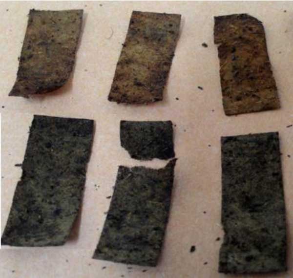 在觀察結束時,與不含納米活性炭的紙張相比,含納米活性炭的紙張降解更徹底,物理結構更脆。大約50%的活性炭紙被完全降解,同時在土壤試塊生物降解試驗中只有1個纖維素紙被完全降解。觀察12周后的紙張外觀如圖2所示。但是,紙張的降解能力也受紙張類型的影響。以往對各類紙張的生物降解性的研究結果表明,不同類型的紙張在受控條件下具有不同的生物降解性。研究發(fā)現(xiàn),除非改變制造工藝,否則報紙和紙巾/紙手帕更難生物降解。