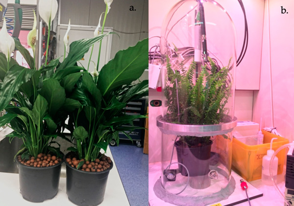 為測(cè)試選擇了三種不同的介質(zhì):活性炭和膨脹粘土、土壤。選定的植物盆栽土壤由泥炭、綠色堆肥、石灰和肥料組成。基材的選擇基于之前的研究,因?yàn)樗鼈兪鞘袌?chǎng)上常見的基材。對(duì)于每種類型的基材,進(jìn)行了六項(xiàng)測(cè)試:三項(xiàng)使用干基材,三項(xiàng)使用濕基材。將基板分別放入塑料容器中,即基板的暴露區(qū)域。測(cè)試了兩種不同的植物(圖1)。每種植物選擇3株進(jìn)行試驗(yàn),并選擇具有相似年齡和大小特征的植物。