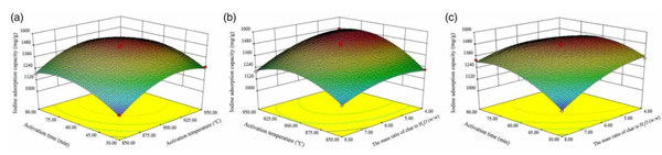 圖1:碘吸附能力的3D表面模型圖(a)活化時(shí)間和活化溫度,(b)炭與水的質(zhì)量比和活化溫度,(c)炭與水的質(zhì)量比和活化時(shí)間。