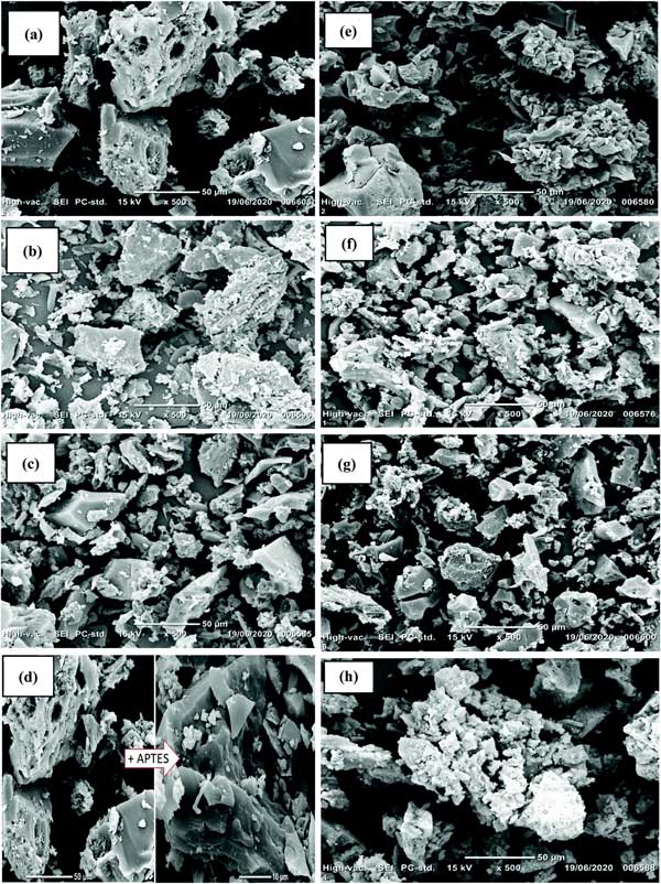 材料的SEM圖像在圖1中給出;钚蕴烤哂胁痪鶆虻墓饣砻妫郊s為50μm(圖1a)。在用硝酸和過氧化氫進(jìn)行氧化處理后,氧物質(zhì)(羧基和硝酸鹽基團(tuán))被接枝,導(dǎo)致活性炭-OH的表面比活性炭更粗糙(圖1e)。通過APTES處理接枝氨基硅烷是成功的:活性炭-APTES和活性炭-OH-APTES表面分別比活性炭和活性炭-OH更光滑(圖1d和f)。裂縫和不均勻的空腔可用作氟化物的吸附位點(diǎn)。存在的粗糙表面和大量白色顆粒證實(shí)了Al顆粒的添加(圖2c、g和h)。這些白色顆?梢詫(yīng)于結(jié)合到材料表面的不同形狀和尺寸的Al納米顆粒的不同簇。