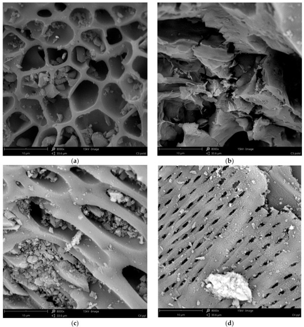 在溶劑加載之前的活性炭通過使用掃描電子顯微鏡作為SEM顯微照片進行表征(圖1)。分析表明,不僅研究不同材質(zhì)活性炭彼此的不同,而且在一種材料中也可能出現(xiàn)不同的結(jié)構(gòu)(圖1a與圖1b、圖1c與圖1d、圖1e與圖1f和圖1g與圖1h)。所有的材料都不是均質(zhì)的,在所有的原材料中,都可以發(fā)現(xiàn)具有不同孔隙率的顆粒、壓實的塊狀,甚至是纖維結(jié)構(gòu)。材料C1(粒徑0.5÷0.75mm的活性炭)是高度多孔的,顆粒充滿可見孔,直徑為5÷11µm,壁光滑(圖1a),顆粒結(jié)構(gòu)的壁密度較低,但也有很大的表面積(圖1b)。粉狀活性炭(C2)具有較小的(圖1d)和較大的(圖1c)孔,具有光滑(圖1c)和較粗糙(圖1d)的壁和細長的形狀。這兩種材料似乎都具有良好的孔隙率和表面,因此它們應該是非常有效的吸附劑。我們的結(jié)果證實,C1和C2在鉭的去除方面都非常有效,去除效率約為97%。C3的多孔性要小得多。雖然有一些顆粒具有相對較高的孔隙(圖1e),但也有較高含量的更致密、相當無孔的塊狀(圖1f)。孔隙結(jié)構(gòu)受到輕微干擾,可能是由植物材料中可能存在的無機化合物晶體造成的(圖1e)。因此,這種結(jié)構(gòu)表明較低的表面和吸附特性。然而,無孔件的表面積似乎很發(fā)達(圖1f)。這是相當虛幻的,因為在使用的所有活性炭中,材料C3的鉭去除效率最低(81%)。最小的大孔材料似乎是C4炭。它由具有緊湊結(jié)構(gòu)的塊(圖1g)和類似于納米管或纖維結(jié)構(gòu)的形式(圖1h)組成。這種材料的多孔性也比C1和C2少,但由于纖維的原因,它的表面應該比C3更發(fā)達,因此它應該具有更好的吸附效率。事實上,這種材料的鉭去除效率略高于C3,但仍低于活性炭C1和C2。根據(jù)這些結(jié)果,可以得出結(jié)論,C1和C2的原材料就具有大孔結(jié)構(gòu)。