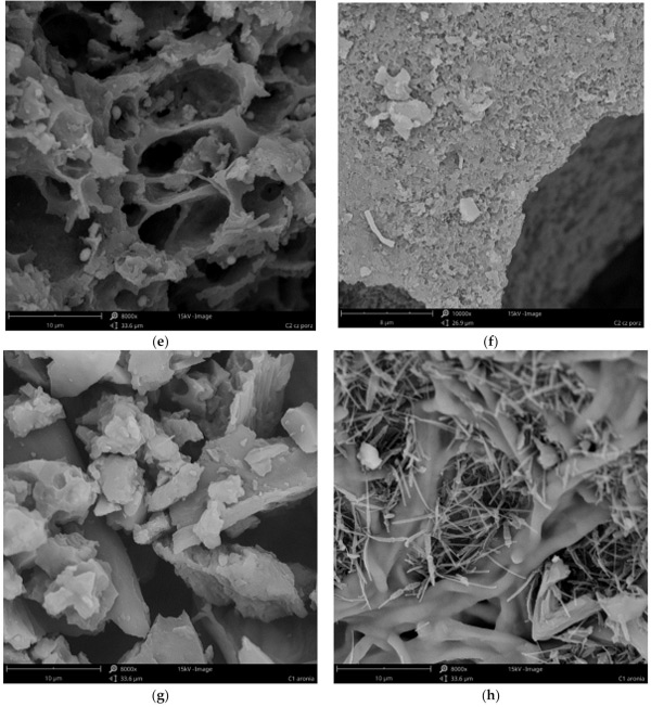 圖1:活性炭的SEM顯微照片(放大倍數(shù)8000倍和10000倍(f)),(a,b)C1(粒徑0.5-0.75mm的活性炭),(c,d)C2(粉狀活性炭),(e,f)C3(碳化纖維素),(g,h)-C4(碳化植物)。