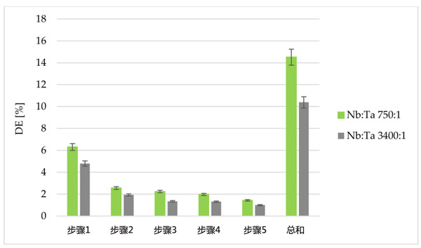 在進一步的研究中,檢查了是否可以多次使用相同部分的浸漬活性炭從鉭中提純鈮。為此,以分批模式進行解吸研究。使用了兩種不同的剝離劑草酸銨和過氧化氫的溶液(圖3),它們與鉭離子形成穩(wěn)定的絡合物。解吸過程分五個步驟進行,在使用4%草酸銨溶液而不是15%過氧化氫溶液的情況下,解吸效率明顯更高。使用第一汽提劑,可以回收保留在活性炭上約50%的鉭。大部分鉭在第一步和第二步中回收,因此在第五步停止解吸,認識到繼續(xù)該過程不會顯著提高所獲得的解吸百分比。解吸效率還受吸附過程中活性炭上保留的鉭量的影響。在批量吸附過程中保留在樹脂上的鉭量的差異是由于使用了具有不同鈮與鉭比率的溶液,同時保持溶液中Nb和Ta離子的可比總濃度。降低活性炭(Nb:Ta=3400:1)上的鉭量會導致解吸效率顯著降低,這可能是由于活性炭結(jié)合了一些鉭離子。