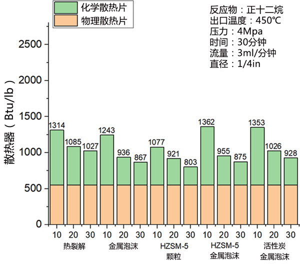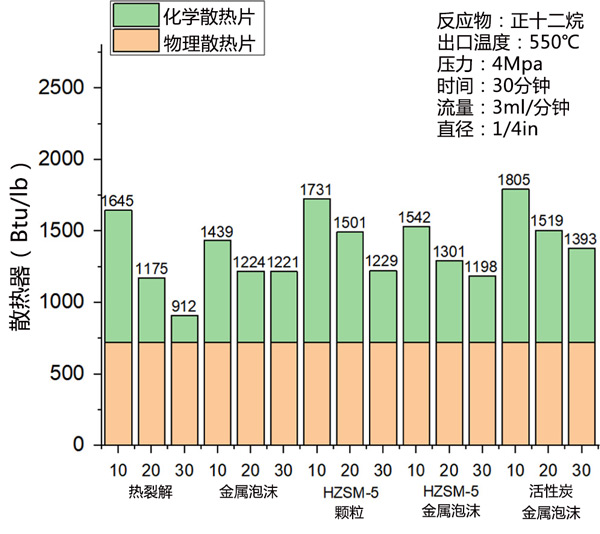 熱裂解和催化裂解產(chǎn)生的散熱片-十二烷在圖2顯示,溫度為450℃,壓力為4MPa。由于散熱器與使用的飛機(jī)冷卻技術(shù)直接相關(guān),因此應(yīng)慎重考慮。測量的散熱器值在10分鐘內(nèi)取平均值,通過將它們除以質(zhì)量流量將瓦特轉(zhuǎn)換為Btu/lb單位。反應(yīng)10分鐘后,HZSM-5/金屬泡沫和活性炭/金屬泡沫樣品的散熱片分別為1342和1353Btu/lb。兩種催化劑在10分鐘內(nèi)都表現(xiàn)出高散熱片。僅金屬泡沫和HZSM-5顆粒的初始散熱器分別為1243和1077Btu/lb。僅涉及金屬泡沫的反應(yīng)的熱沉低于熱裂解的熱沉。由于反應(yīng)溫度低,泡沫不作為金屬催化劑并占據(jù)反應(yīng)空間30分鐘。HZSM-5顆粒在反應(yīng)的前30分鐘內(nèi)導(dǎo)致最低的熱沉,因為氣體產(chǎn)率低且產(chǎn)生大量線性石蠟。相比之下,熱裂化的散熱器保持在高值30分鐘。因此,在低反應(yīng)溫度下,酸和金屬催化劑均表現(xiàn)出低催化效率并占據(jù)反應(yīng)空間。