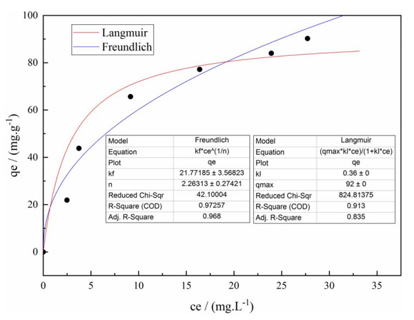 當(dāng)反應(yīng)溫度為25℃,投加量為8g/L時(shí),可獲得不同初始濃度下亞硝基二乙胺的平衡濃度和改性活性炭的平衡吸附容量。使用Langmuir和Freundlich熱力學(xué)方程對(duì)數(shù)據(jù)進(jìn)行擬合,結(jié)果如所示圖3從圖中可以看出,吸附過(guò)程不符合Langmuir等溫線方程,F(xiàn)reundlich吸附等溫線方程也適用。當(dāng)初始濃度達(dá)到一定值時(shí),吸附趨于平衡并達(dá)到飽和。