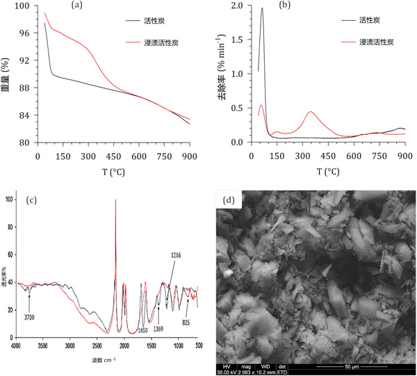 圖1:活性炭和浸漬活性炭的理化特性:(a)熱重分析失重曲線,(b)熱重失重率曲線,(c)FTIR光譜,(d)SEM顯微照片(僅限浸漬活性炭)。