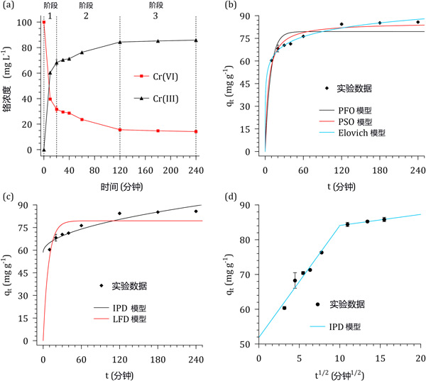 圖2:(a)六價鉻溶液和浸漬活性炭接觸時間對Cr濃度和形態(tài)的影響。(b)反應(yīng)動力學(xué)模型、(c)擴(kuò)散模型和(d)線性化的顆粒內(nèi)擴(kuò)散模型。