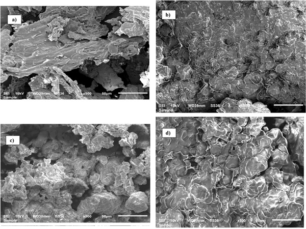 圖1:(a)活性炭和(b)氯化鋅改性和(c)草酸改性和(d)氯化鋅/硫化銅改性的SEM圖像。