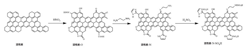 以活性炭為原料,用HNO3氧化,用乙二胺胺化。得到的中間體用硫酸水溶液處理以產(chǎn)生硫酸氫活性炭催化劑。通過過濾分離產(chǎn)物并在105℃干燥24小時(shí);钚蕴康木唧w制備方案如圖1所示。