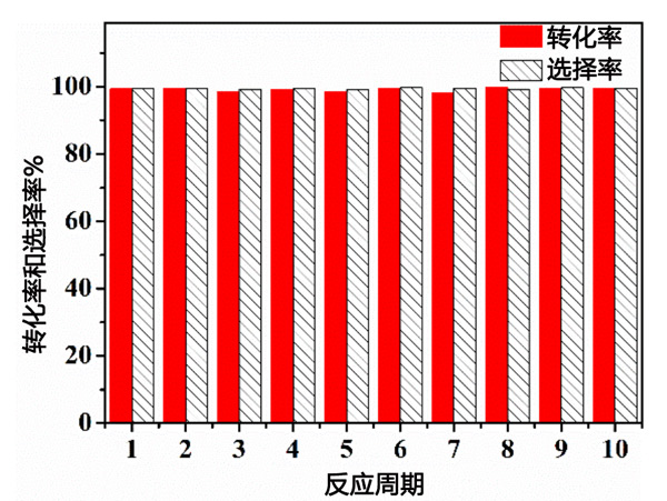最后通過回收實(shí)驗(yàn)測試了活性炭催化劑的穩(wěn)定性,測試結(jié)果如圖3所示。在催化劑可重復(fù)使用性能的探索中,活性炭催化劑用溶劑環(huán)己烷洗滌,然后進(jìn)入下一個(gè)反應(yīng)循環(huán)。具體過程為將反應(yīng)完成后的固體離心分離出來,再用環(huán)己烷洗滌固體3次,以完全去除前一輪反應(yīng)表面殘留的少量液體。即使在連續(xù)運(yùn)行10次后,催化劑的性能也沒有顯著降低,仍然達(dá)到99%的苯甲醛轉(zhuǎn)化率和99%的選擇性。因此,活性炭催化劑是用于研究苯甲醛乙二醇縮醛反應(yīng)的優(yōu)異且穩(wěn)定的可回收固體酸催化劑。