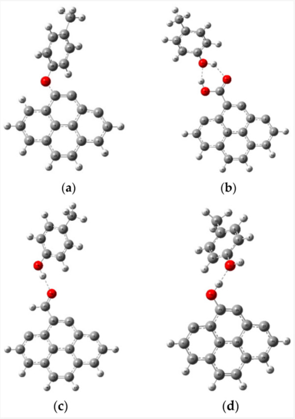 預(yù)計(jì)甲酚在活性炭上的吸附將通過(guò)各種類型的相互作用進(jìn)行,例如電子供體-受體機(jī)制、靜電相互作用、π-π相互作用和氫鍵形成。然而,在各種類型的相互作用中,活性炭和被吸附物之間的氫鍵是有助于吸附過(guò)程的重要相互作用類型之一。因此,在本研究中,使用DFT方法研究了對(duì)甲酚和活性炭之間的氫鍵相互作用。考慮到它們之間的氫鍵,研究了對(duì)甲酚與原始活性炭和功能化活性炭的相互作用。圖1代表各種相互作用的優(yōu)化結(jié)構(gòu)。