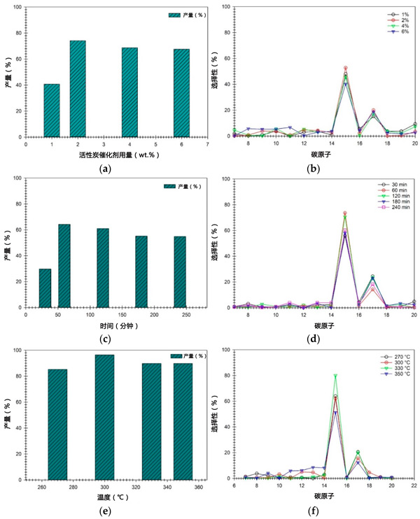活性炭催化劑負(fù)載對烴類轉(zhuǎn)化和產(chǎn)物分化的影響如圖3a、b所示。脫氧反應(yīng)在惰性N2氣氛中在300℃的反應(yīng)溫度和500rpm的攪拌速度下進(jìn)行30分鐘。評估了催化劑負(fù)載量(即1-6wt.%)的影響。數(shù)據(jù)表明,脫氧性能和分化均在1-2wt.%的活性炭催化劑負(fù)載范圍內(nèi)升高,但隨后在催化劑負(fù)載>2wt.%后下降。產(chǎn)率和產(chǎn)物選擇性當(dāng)使用2wt.%時,其效果更好,即分別為47.13%和72.85%。相反,在催化劑負(fù)載量超過2wt.%時,脫氧性能和選擇性的下降可能反映了催化劑的負(fù)載過重,由于不同的活性位點(diǎn)的剩余活性位點(diǎn),這將促進(jìn)對二級和并行反應(yīng)的驅(qū)動。
