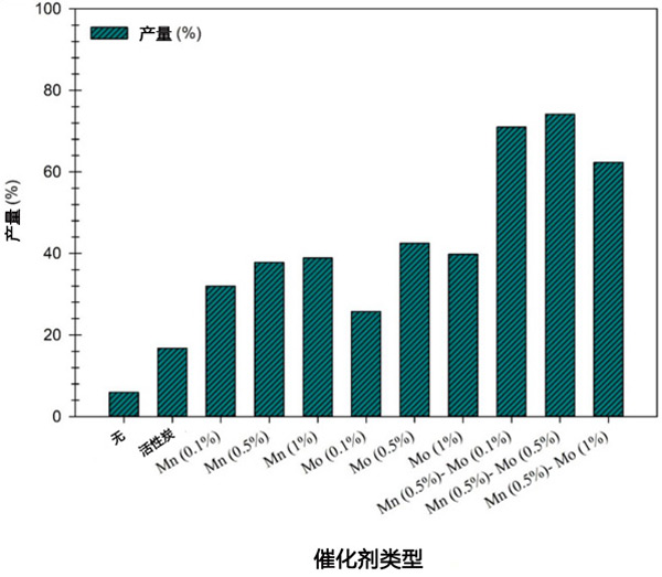 當(dāng)廢油對Mn/活性炭和Mn-Mo/活性炭催化劑樣品進(jìn)行脫氧反應(yīng)時,產(chǎn)物包括液態(tài)正烷烴和烯烴,以及含氧中間體物質(zhì),例如醇,醛和酮,以及汽化的CO和CO2。單獨(dú)或兩種活性炭金屬催化劑生產(chǎn)提供了優(yōu)異的轉(zhuǎn)化和完全差異化在廢油的溶解氧過程。活性炭催化劑的反應(yīng)性能主要取決于Mn和Mo表面密度以及催化劑的酸度。脫氧反應(yīng)在300℃的反應(yīng)溫度和500rpm的攪拌速度下在惰性N2中進(jìn)行30分鐘氣氛。對活性炭上Mn和Mo負(fù)載百分比的篩選表明,與0.1wt.%相比,將活性炭負(fù)載0.5wt.%將烴產(chǎn)率從31.9%提高到37.9%,并將Mo負(fù)載量從0.1wt.%提高至0.5wt.%導(dǎo)致產(chǎn)率從25.7%增加到42.4%。篩選結(jié)果表明,最佳的錳負(fù)載百分比為0.5wt.%,并選擇了此百分比。Mo對Mn催化劑的影響從0.1到1wt.%負(fù)載百分比進(jìn)行了研究,結(jié)果表明0.5wt.%的Mn和Mo是合適百分比,烴收率為74%(圖2)。