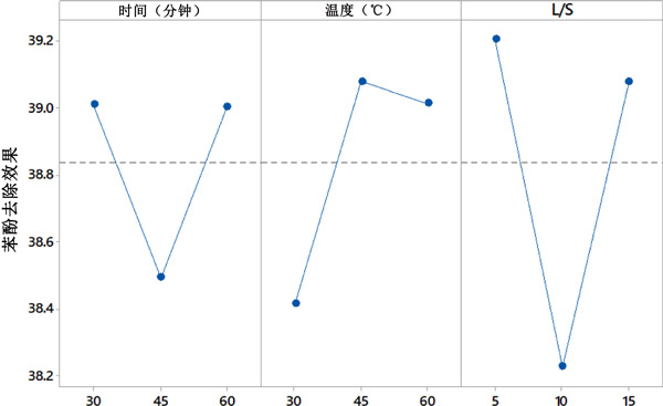 田口法用于優(yōu)化參數(shù),即時間、溫度和L/S,這些參數(shù)直接取決于苯酚的去除。選擇田口方法的選項越大越好。本研究的主要目的是活性炭從廢水中去除較多的苯酚,因此選擇了越大越好的選項。此外,采用添加劑模型來確定各個輸入參數(shù)對去除苯酚濃度的影響。這種分析稱為因子效應的確定,結果見圖2。