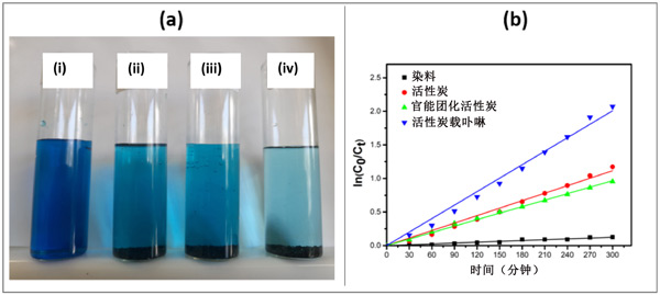 圖3:(a)過(guò)濾可見(jiàn)光照射5小時(shí)后MB溶液的照片。(i)單獨(dú)的MB,(ii)MB與活性炭,(iii)MB與官能團(tuán)化活性炭,和(iv)MB與活性炭載卟啉,(b)亞甲藍(lán)降解的動(dòng)力學(xué)線性模擬曲線。