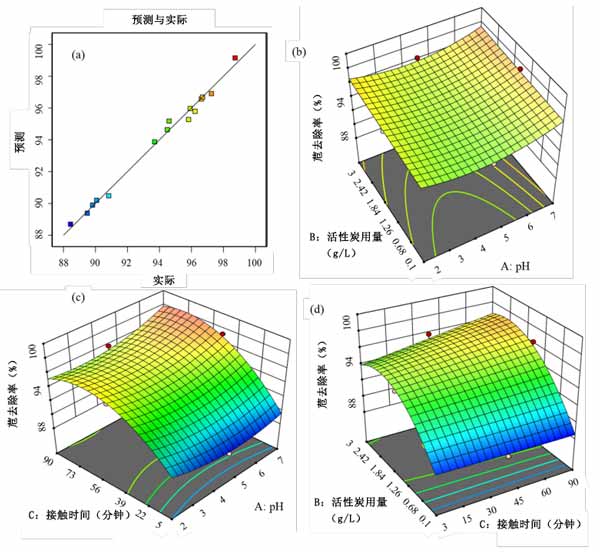 圖2:(a)預(yù)測的乙腈去除量與實(shí)際去除量的關(guān)系圖,(b)乙腈去除量的pH值與活性炭用量的3D圖,(c)乙腈去除量的pH值與接觸時(shí)間的3D圖,(d)3D圖接觸時(shí)間與活性炭用量的苊去除圖。