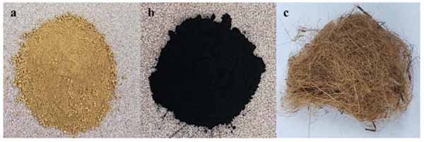 圖1:(a)紅土、(b)活性炭和(c)椰殼纖維的圖像。