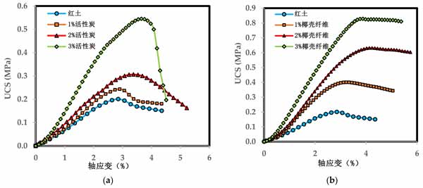 圖3:(a)活性炭試樣和(b)椰殼纖維試樣的UCS結果。