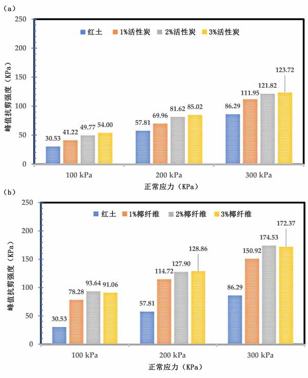 2、在活性炭土中添加椰殼纖維可改善力學參數(shù),例如峰值剪切強度、摩擦角、內(nèi)聚性、柔韌性和剩余強度,這些是建筑工程中的關鍵參數(shù)。