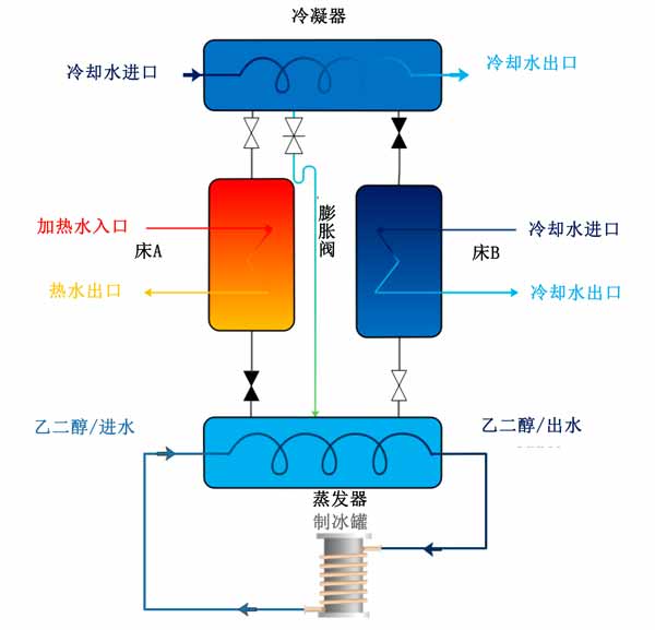 吸附制冰系統(tǒng)的兩床配置來檢查使用50%活性炭、10%聚乙烯醇和40%石墨烯納米片的復合吸附劑。制冰可以通過循環(huán)乙二醇來完成,乙二醇在-2℃下進入吸附制冷的蒸發(fā)器,并帶有外部制冰塊,如圖1所示。復合活性炭吸附劑應(yīng)用于吸附床中普通銅管的外表面上,加熱和冷卻流體被泵入管內(nèi)。加熱和冷卻水在四個過程(預熱、解吸、預冷和吸附)之間在兩個床之間切換,完成一個床循環(huán)。根據(jù)操作模式,切換閥用于將蒸發(fā)器和冷凝器與吸附床連接起來。