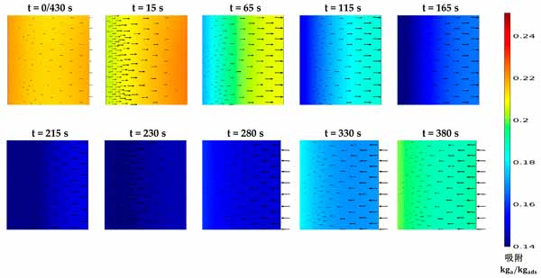 活性炭復合吸附劑的壓力和溫度決定了平衡吸收,它代表了在給定時間分別在吸附和解吸階段可以達到的最大和最小吸收容量。然而,顆粒內(nèi)和顆粒間的傳質(zhì)阻力表明吸附材料在每種給定情況下可以多快達到其平衡吸收能力。這突出了在本研究中同時求解兩種傳質(zhì)機制與其他控制方程的重要性,以顯示促進傳熱對傳質(zhì)的凈效應(yīng)。圖2顯示了在430秒循環(huán)時間內(nèi),考慮到預熱和預冷階段均為30秒的時間間隔內(nèi)代表性部分的固結(jié)吸附劑域的溫度分布。