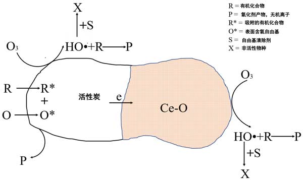 圖1:活性炭二氧化鈰催化的臭氧化過程中發(fā)生的主要反應(yīng)途徑示意圖。