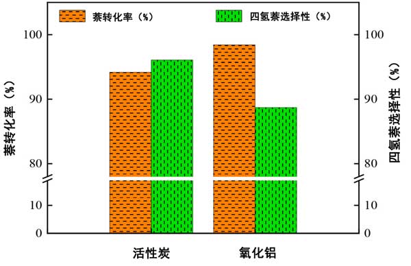 圖3:活性炭和氧化鋁催化劑的萘轉化率和四氫化萘選擇性。