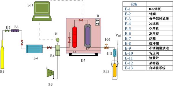 首先,來自儲罐的CO2通過標稱尺寸為1µ的過濾器,以避免任何雜質(zhì)進入工藝路徑。然后,CO2被引導至冰箱單元,其溫度降至-10℃和60bar。液化CO2使用往復泵加壓,并轉(zhuǎn)化為殼管式配置的調(diào)壓鼓。在這個鼓中,流體溫度被設置為適當?shù)臏囟纫赃_到超臨界流體條件。該鼓的設計旨在減少波動,熱交換通過使用溫度精度設置為1K的1000W元件循環(huán)水進行。壓力表安裝在調(diào)壓鼓的輸出端,以顯示出口流體壓力。之后,液體被引導到裝有10克活性炭和玻璃珠的萃取池。在提取單元的輸入和輸出處安裝了兩個孔隙率為1微米的過濾器,以防止顆粒逸出。細胞中玻璃珠的存在使CO2均勻分布在提取單元內(nèi)。在用SC-CO2加載萃取池后,將萃取池設置在適當?shù)臏囟群蛪毫ο录s45分鐘。在靜態(tài)階段之后,動態(tài)階段從打開采樣閥開始。為了防止閥門凍結,它被包裹在加熱元件中。在動態(tài)時間內(nèi),使用冰柜將樣品采集溫度保持在0℃以下。每個實驗一式三份進行,圖1顯示了超臨界流體裝置的詳細信息,通過將每個初始活性炭的溶質(zhì)重量除以計算超臨界回收率。
