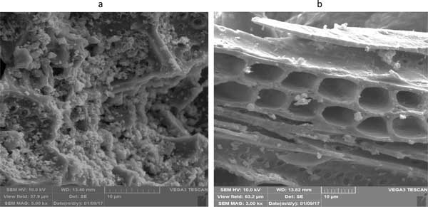 如前所述,通過掃描電子顯微鏡(SEM)評估了未提取和提取的活性炭樣品的結構和表面形態(tài)。圖3a、b顯示了活性炭在超臨界再生之前(a)和之后(b)的兩張顯微照片。未處理樣品的顯微照片顯示不均勻且粗糙的表面均勻覆蓋有一層溶質(zhì)。由于用超臨界二氧化碳萃取獲得的高回收效率,處理過的樣品的結構更加多孔,表面明顯收縮并耗盡溶質(zhì)。