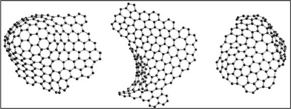 活性炭的具體原子構(gòu)型尚不清楚,盡管它在水和空氣凈化方面具有重要的商業(yè)意義。通過(guò)熱解法制備的碳的構(gòu)型。她指出,這些碳可以分為兩個(gè)不同的組,即石墨化和非石墨化;钚蕴垦苌龅奶际欠鞘,這意味著即使在非常高的溫度(≥3000℃)下,它也可以轉(zhuǎn)變?yōu)榻Y(jié)晶石墨。中子衍射研究表明,非石墨化碳具有類似于富勒烯的骨架,如圖1所示。這種配置將闡明碳的微孔結(jié)構(gòu)及其其他特性。從x射線和中子衍射研究中獲得的衍射數(shù)據(jù)已根據(jù)由非六角環(huán)組成的結(jié)構(gòu)進(jìn)行了闡明,但無(wú)法提供任何明確的證據(jù)表明原子以五角環(huán)或六角環(huán)的形式鍵合。