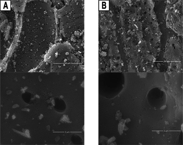 圖2:SEM顯微照片(A)酸洗活性炭(B)活性炭。