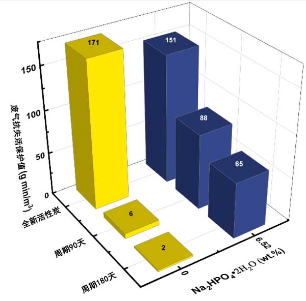 圖3:二水合磷酸二氫鹽(Na2HPO4·2H2O)對(duì)新的和失活的活性炭保護(hù)值的影響。