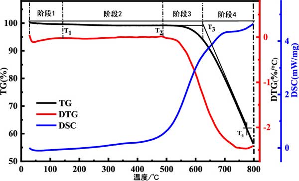此后,樣品開始進入熱分解階段,范圍為T2至T3。在此階段,活性炭表面的一些含氧官能團和芳環(huán)等大量內部結構被破壞,質量損失率逐漸增大。此外,DSC曲線的放熱速率繼續(xù)增加。