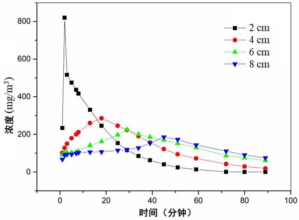 乙醇作為吸附物。截面風(fēng)速設(shè)定為0.3m/s。飽和吸附濃度為200mg/m3。脈沖時間為2分鐘。脈沖倍數(shù)為20倍。通氣方式為正壓通氣。不同高度出口濃度隨時間變化曲線如圖4所示。