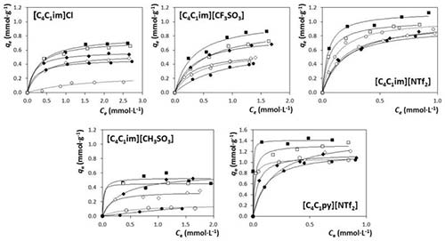 得到的結(jié)果表明,活性炭的不同的吸附能力與IL的性質(zhì)和溶液中的鹽量有關(guān)。一般而言,對(duì)于咪唑鎓的ILs,陰離子對(duì)其對(duì)活性炭的吸附能力的影響按照以下順序:Cl - ≈[CH 3 SO] <[CF 3 SO 3 ] -<[NTf 2 ] 。這一趨勢(shì)的結(jié)果和預(yù)計(jì)的相符合,并且表明,隨著陰離子疏水性的增加,活性炭對(duì)ILs的吸附逐漸增加。另一方面,考慮到IL陽(yáng)離子家族,活性炭能吸附更多的吡啶鎓比基于咪唑類的對(duì)應(yīng)物?傊,這里證明,如果伴隨使用無(wú)機(jī)鹽來(lái)促進(jìn)鹽析現(xiàn)象并增強(qiáng)隔離度,則活性炭也可以用作水介質(zhì)中低濃度存在的親水性IL的有效吸附劑。得到的結(jié)果表明, 在鹽的存在下,親水性ILs的例如[C 4 C 1 im] Cl和[C 4 C 1 im] [CH 3 SO3 ]的K d值增加高達(dá)5.5倍。這種新方法可以被設(shè)想為減少由使用IL的工業(yè)過(guò)程產(chǎn)生的含水物流污染的有希望的途徑。