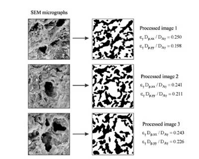 通過掃描電子顯微鏡使用2400倍放大倍數(shù)檢查活性炭的形態(tài)。使用圖像處理工具箱處理圖像。程序如下。首先,通過將灰度轉(zhuǎn)換為灰度(從0(黑色)到255(白色)]來改善黑暗和光照區(qū)域之間的對比度。由于深色區(qū)域在視覺上指示深刻,所以假設這些代表孔隙占據(jù)的部分,而淺色區(qū)域與固體基質(zhì)(活性炭)有關(guān)。這個想法一點,每個象素的灰度值被跟蹤(來自黑色),并累積,得到體積分數(shù) ε γ 的較暗的像素。其次,具有等于或小于閾值的值的所有像素被轉(zhuǎn)換成白色(被孔占據(jù)的空間),而具有較高值的像素被轉(zhuǎn)換成黑色(實心矩陣)。最后,為了增強輪廓的定義,應用濾波器。這個程序允許我們獲得最終的二值圖像,其中白色和總像素數(shù)之間的比率等于活性炭的孔隙率。事實上,來自SEM顯微照片的處理圖像提供了解決閉合問題的領(lǐng)域。