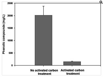 在生物乙醇生產(chǎn)過程中,有毒的呋喃衍生物(糠醛和5-羥甲基糠醛)和酚類化合物在酸解過程中生成,已知會(huì)抑制細(xì)胞生長和乙醇生成。在使用20g玉米殼和4%(v / v)H 2 SO 4的水解物制備后,我們通過活性炭處理除去了這些化合物。如圖4所示,該過程導(dǎo)致總酚值從2015.2降至153.3 mg / l,相當(dāng)于總酚類化合物減少92.3%。然后將該活性炭處理的水解產(chǎn)物用于生物乙醇生產(chǎn),并與未處理的水解產(chǎn)物進(jìn)行比較。