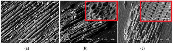 圖中顯示了活性炭和對比材料的SEM背散射電子圖像(BSI)?梢钥闯,活性炭其表面上具有排列良好的孔隙。然而,由于高分子量揮發(fā)物的釋放,鋸末的纖維結(jié)構(gòu)在熱解后被改變,這影響了孔的數(shù)量和直徑,觀察到尺寸為9-16μm的較小的孔和尺寸為21-48μm的較大的孔。這也表明,形成了幾個(gè)良好的方向微孔與尖銳和彎曲的邊緣形成。孔隙率增加,由于脂族C結(jié)構(gòu)與芳族C結(jié)構(gòu)變換。