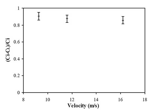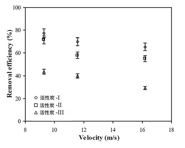 流速同時(shí)影響氣體吸附和活性炭回收,因?yàn)樗婕皻怏w和活性炭顆粒的混合程度、。圖3在各種活性炭吸附劑尺寸下,氣體去除效率和流量之間呈現(xiàn)出輕微的反比關(guān)系。最小的吸附劑(活性炭-1)以9.26米/秒除去77.4%的甲苯蒸氣,然后以16.2米/秒降至65.4%。微粒活性炭吸附劑捕獲沿著旋風(fēng)分離器的流動(dòng)路徑行進(jìn)的甲苯蒸氣。雖然在前面的的內(nèi)容說過吸附量以高速增加,但是氣體去除效率相當(dāng)?shù)。這是因?yàn)樵诟吡髁肯录妆降慕^對(duì)體積要高得多。因此,即使活性炭吸附得更多,更多的氣體分子傾向于流出而沒有在內(nèi)部吸收。因此,關(guān)于顆;厥蘸蜌怏w去除效率的最佳流量必須通過在各種操作條件下的眾多實(shí)驗(yàn)來確定。