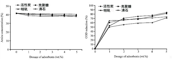 圖3顯示活性炭和沸石的應用不顯著影響單乙醇胺濃度水平。在5重量%的活性炭中,MEA濃度從41%降至39%。途圖中顯示胺濃度(%)的水平恒定為1重量%的吸附劑至5重量%的吸附劑。