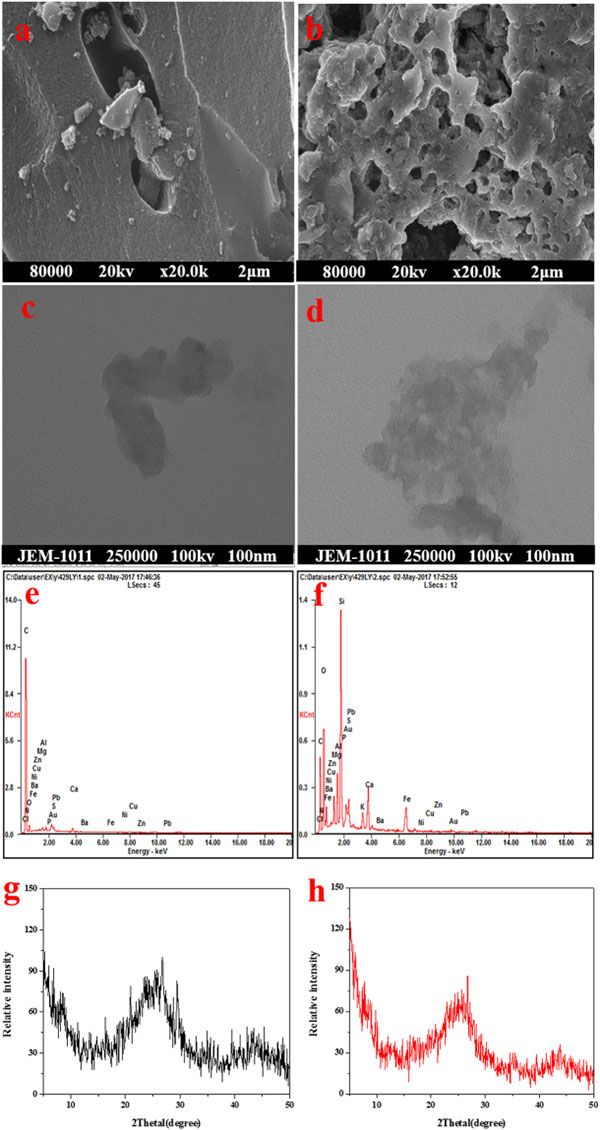 圖1:兩種吸附劑的代表性SEM,TEM和EDS圖像。(a)活性炭的SEM(比例尺為2μm),(b)活性炭的TEM(比例尺為100nm),(c)活性炭的EDS,(d)改性活性炭的SEM(比例尺為2μm),(e)改性活性炭的TEM(比例尺為100nm),(f)改性活性炭的EDS,(g)活性炭的XRD,(h)改性活性炭的XRD。