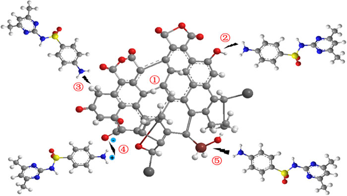圖3:磺胺二甲嘧啶和改性活性炭之間合理相互作用的示意圖。1.微孔捕獲。2.氫鍵相互作用。3.π-πEDA相互作用。4.靜電相互作用。5.配位相互作用。