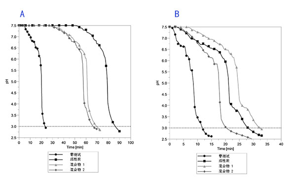 圖1a顯示了在上述的試驗(yàn)結(jié)果。可以看出,在22分鐘后,氣體洗滌瓶中的pH值降至3以下,而在反應(yīng)器中不使用活性炭吸附劑樣品。用活化的氧化鋁樣品裝載反應(yīng)器分別產(chǎn)生66和71分鐘的穿透時(shí)間。用浸漬的活性炭實(shí)現(xiàn)了最佳性能,即氯化氫吸附容量為0.0288g/g。將氣體流速提高所取得的結(jié)果如圖1b所示。要進(jìn)行的第一次試驗(yàn)是在反應(yīng)器中沒有活性炭吸附劑負(fù)載,并且在12分鐘后氣體洗滌瓶中去離子水的pH值降至3以下。對(duì)于浸漬的活性炭,氯化氫吸附容量從0.0288g/g降低至0.0172g/g。